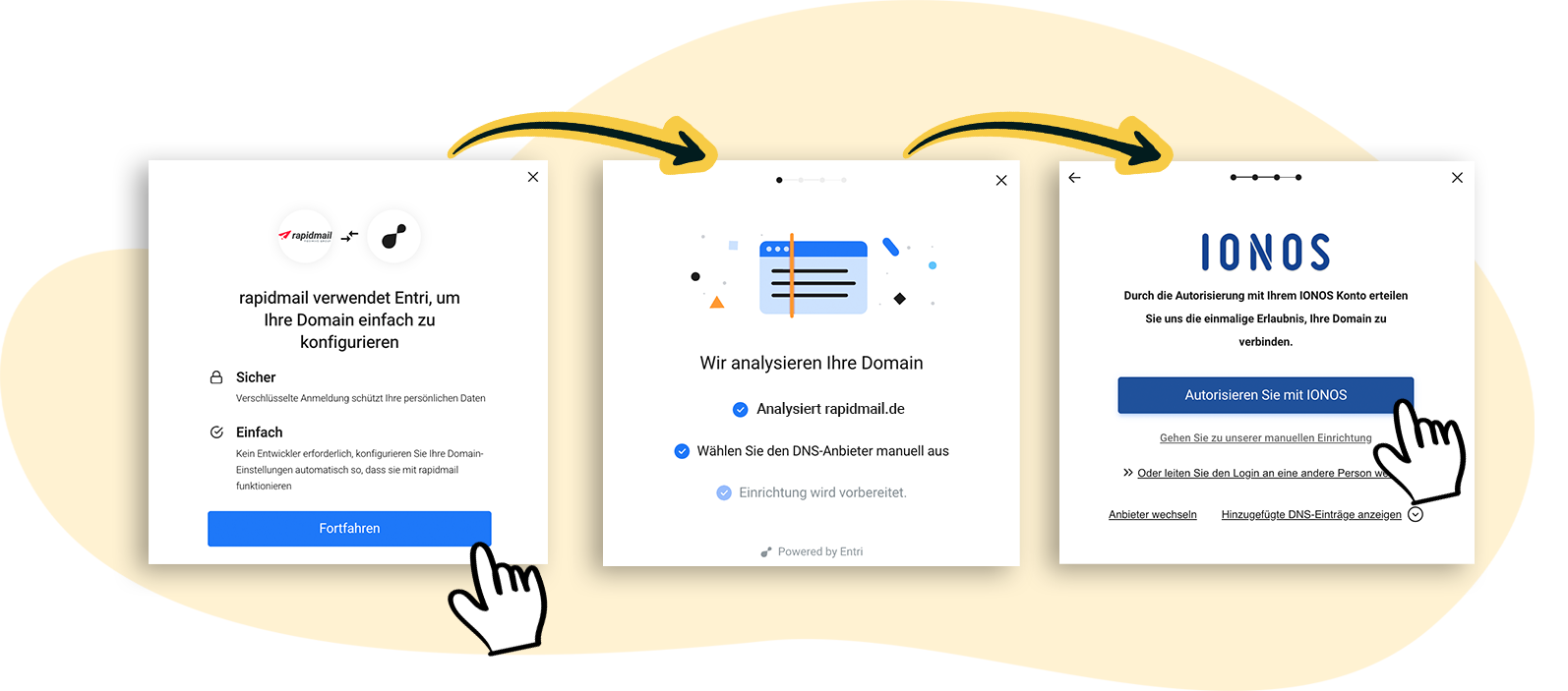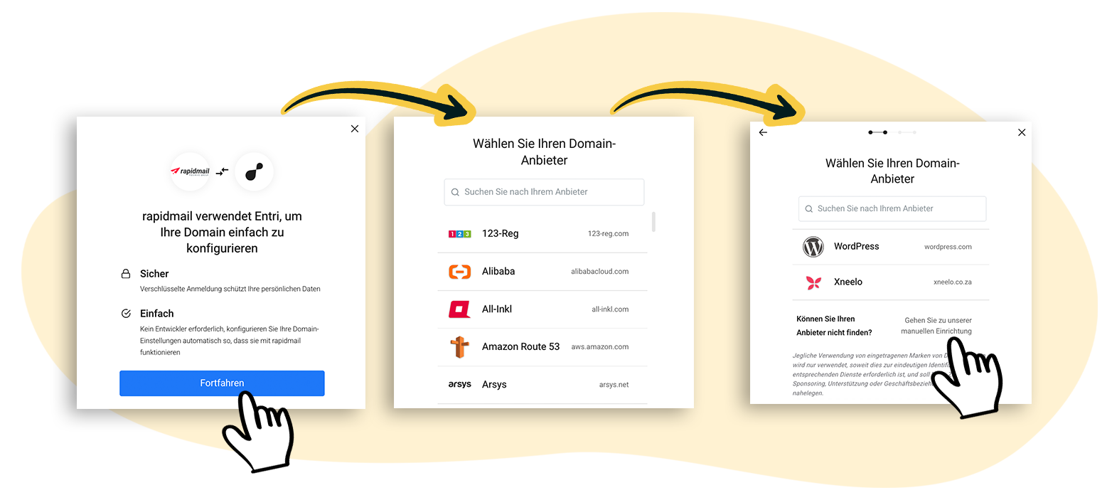 Entri erzeugt in diesem Prozess automatisch zwei DKIM-Keys sowie einen SPF- und DMARC-Record und erkennt Ihren Webhoster. Sie werden dazu aufgefordert, sich bei Ihrem Webhoster bzw. Domain-Anbieter einzuloggen, damit die entsprechenden Werte von Entri automatisch dort hinterlegt werden können.
