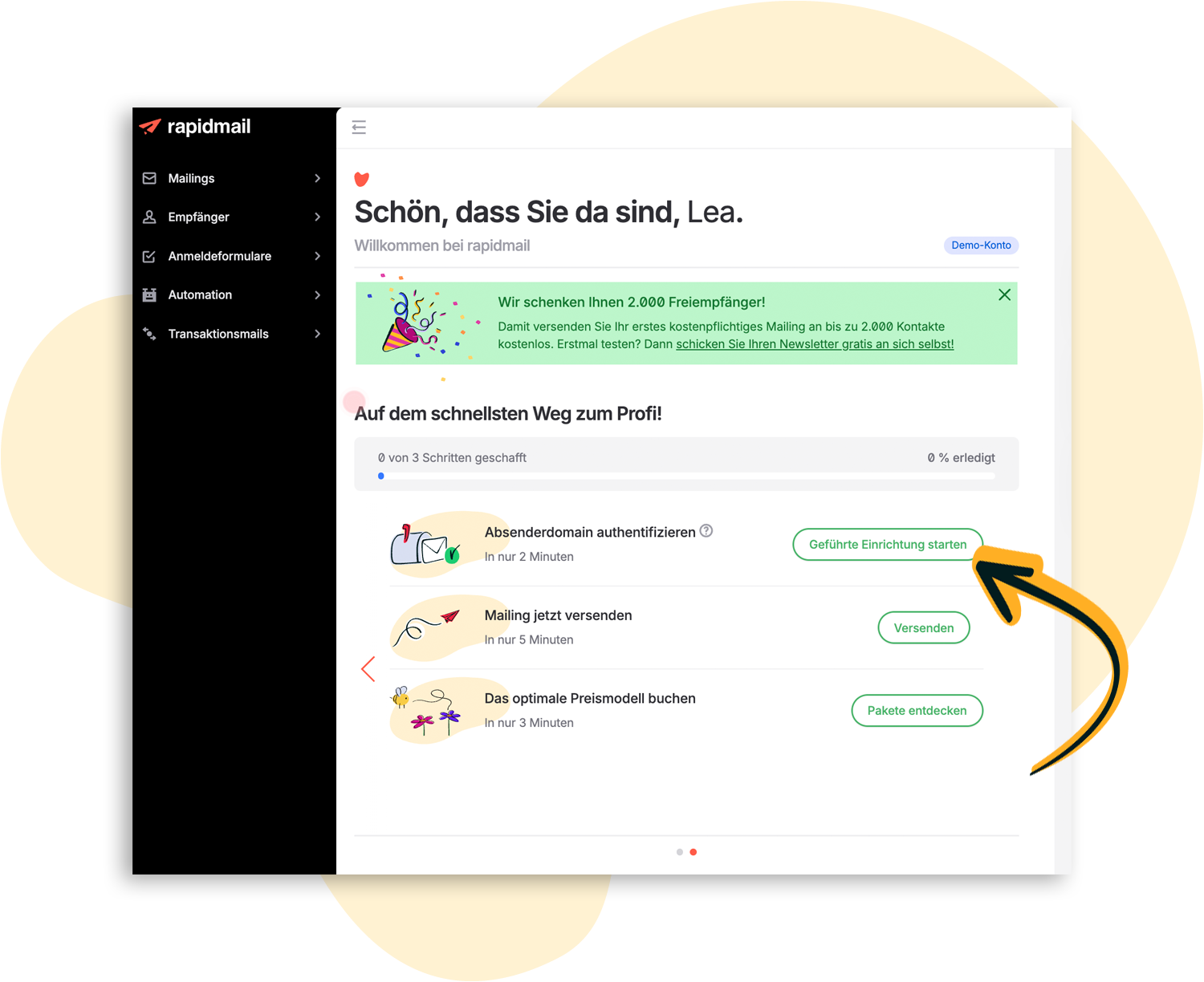Die To-do-Liste sehen Sie direkt auf Ihrem Dashboard. Hier finden Sie allerhand nützliche To-dos, die Ihnen bei der erfolgreichen Konfiguration Ihres rapidmail Accounts helfen. Auf der zweiten Seite der Liste finden Sie das To-do Absenderdomain authentifizieren. Klicken Sie den grünen Button Geführte Einrichtung starten, um mit der Authentifizierung zu beginnen.