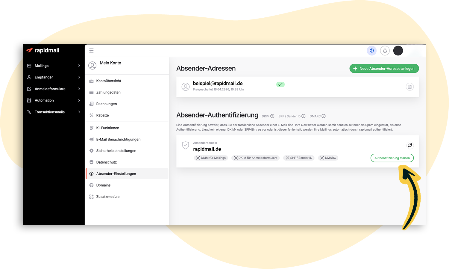 Klingt nach kompliziertem Fachlatein? In Ihrem rapidmail Konto können Sie diese Authentifizierungen mit nur wenigen Klicks bewerkstelligen. Dieser Artikel erklärt Ihnen, wie Sie die Authentifizierung starten können.