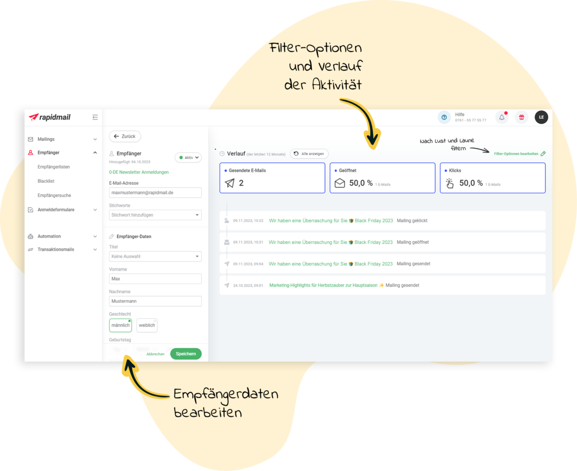 Mit unserer neuen Funktion für Ihre Empfängerverwaltungkönnen Sie für Ihre individuellen Kontakte nicht nur die Informationen zu versendeten Newslettern einsehen, sondern haben auch die Kennzahlen für automatisch versendete Mailings (z. B. die jährlichen Geburtstagsgrüße) und alle Statusänderungen (z. B. von unbestätigt zu aktiv) im Blick. Dank verschiedener Filteroptionen können Sie selbst entscheiden, welche der Kennzahlen im Aktivitätsverlauf auftauchen sollen!