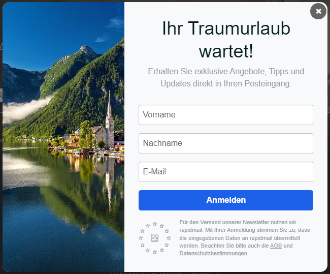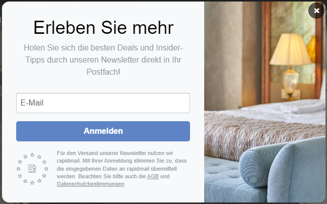 Ein Pop-up-Anmeldeformular auf Ihrer Website kann zu Beginn besonders effektiv sein, um neue Newsletter-Abonnent:innen zu gewinnen. So können sich Interessierte schnell für Ihren Hotel-Newsletter anmelden, und Sie haben die Gelegenheit, sie mit speziellen Kennenlernangeboten zu überzeugen. Das macht neugierig und schafft einen Anreiz, Ihre Unterkunft bald persönlich zu besuchen. So steigern Sie die Direktbuchungen über Ihre Website und verringern die Abhängigkeit von den bekannten Reiseplattformen und Online-Reisebüros mit ihren hohen Vermittlungsgebühren.