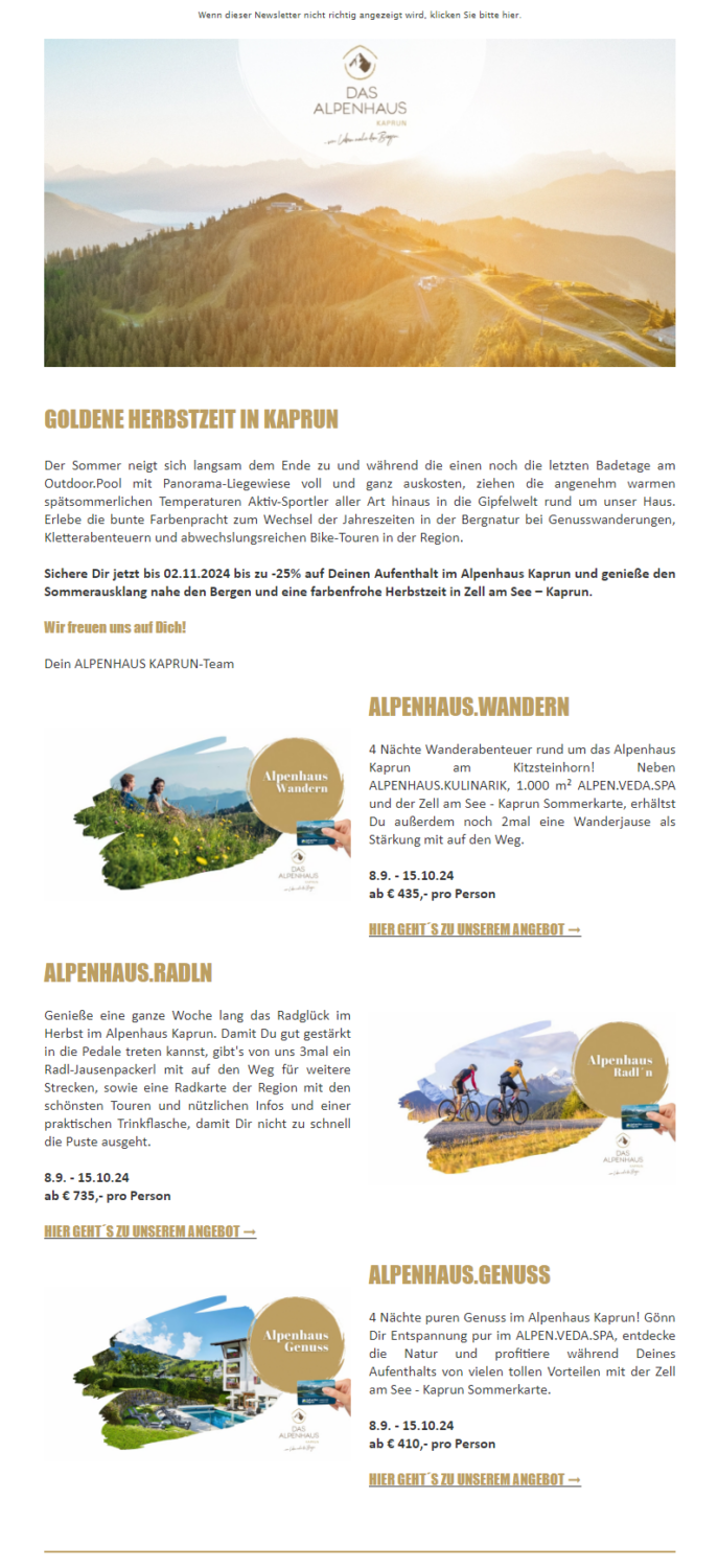 Last but not least: Fordern Sie Ihre Leserinnen und Leser mit einem Call-to-Action-Button auf, aktiv zu werden – sei es, dass sie sich näher über das Winter-Wellness-Wochenende in Ihrem Hotel informieren oder sich für den von Ihnen beworbenen Cocktailabend an der Hotelbar anmelden.
