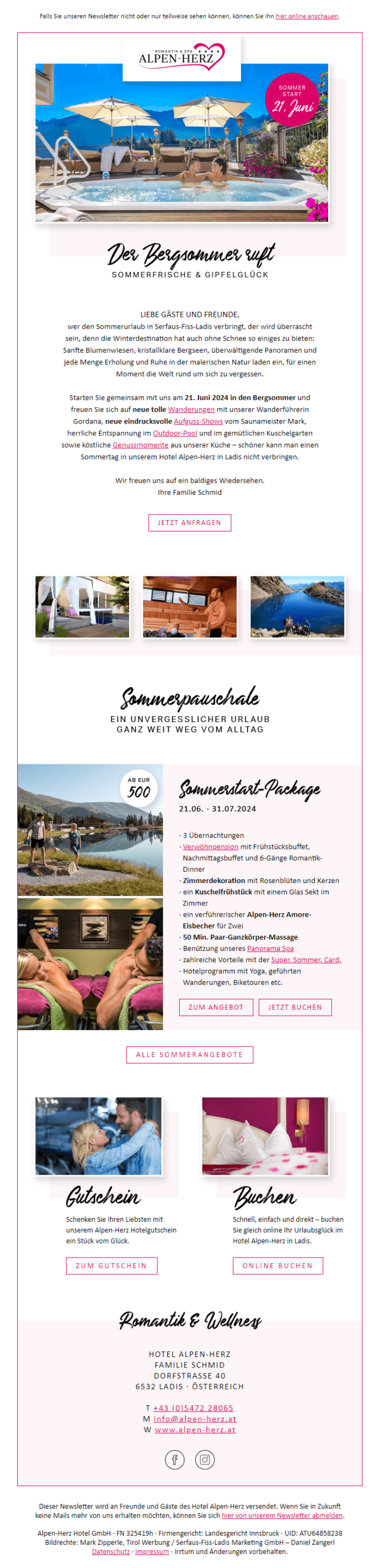 Schaffen Sie VIP-Erlebnisse: Bieten Sie Ihren Newsletter-Leser:innen exklusive Informationen, die sie nur über den Newsletter erhalten und nirgendwo sonst auf Ihrer Website finden. Das können Insider-Tipps für die Region, Geheimrezepte des „Chef de Cuisine“ oder exklusive Einblicke hinter die Kulissen Ihres Hotels sein. Solche Inhalte schaffen einen zusätzlichen Mehrwert, der die Anmeldung zum Newsletter noch attraktiver macht. Die Abonnent:innen sollen das Gefühl bekommen, zu einem auserwählten Kreis zu gehören, der besondere Vorteile genießt.