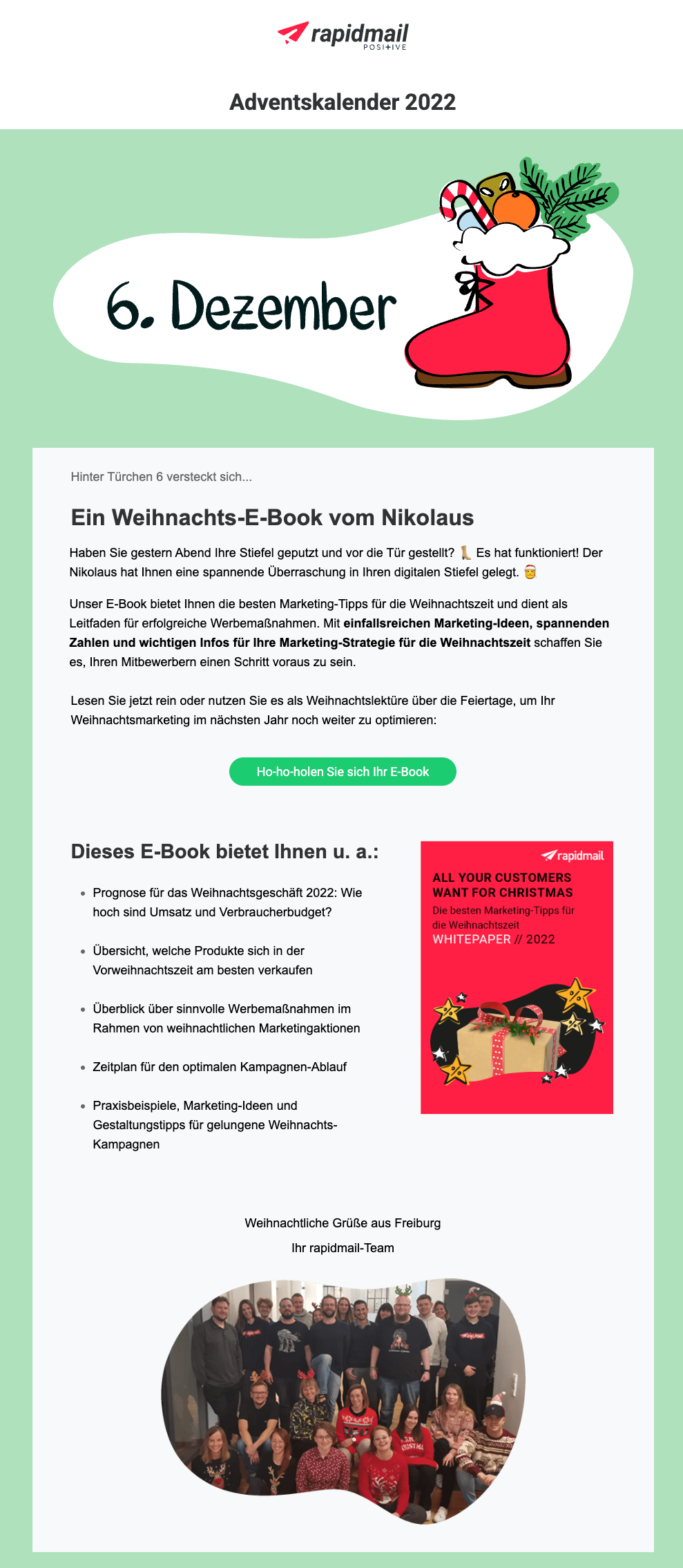 - ✔️ Umsetzung mit rapidmail: Planen Sie die Kampagne mit einem Content-Kalender, richten Sie eine E-Mail-Automation für den täglichen Versand ein, nutzen Sie unsere festlichen Adventskalender-Vorlagen.