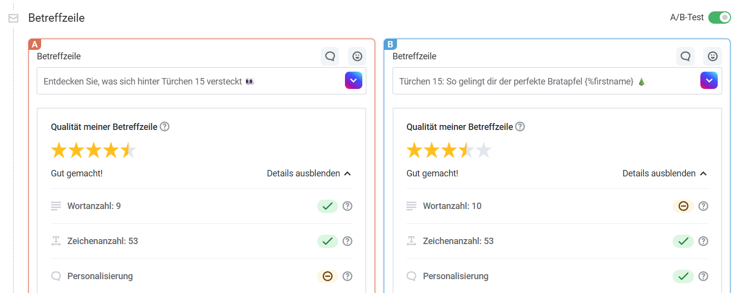 Mit A/B-Tests können Sie ganz einfach herausfinden, welche Version Ihres Adventskalender-Newsletters Ihren Kontakten am besten gefällt – und so Schritt für Schritt Ihr perfektes Erfolgsrezept finden. Testen Sie zum Beispiel unterschiedliche Betreffzeilen: Funktioniert eine emotionale, verspielte Formulierung besser oder überzeugt Ihre Zielgruppe eher ein klarer, sachlicher Ton? Finden Sie mit jedem Test ein bisschen besser heraus, wie Sie Ihre E-Mail-Türchen zum Glänzen bringen. ✨