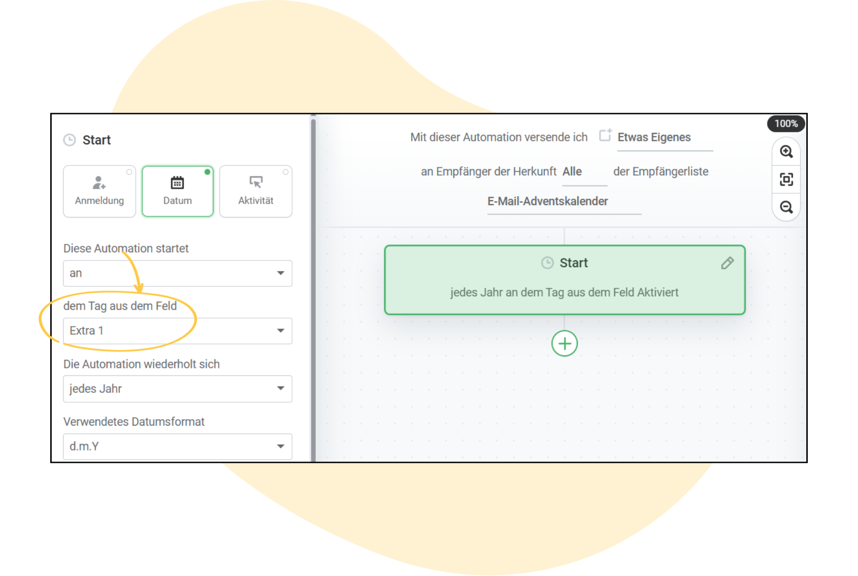 Nun legen Sie die Startbedingung fest: Wählen Sie „Datum“ und aktivieren Sie die Option „Diese Automation startet an dem Tag aus dem Feld Extra 1“. Entscheiden Sie anschließend, ob sich der Workflow nur einmalig (z. B. 2025) oder jährlich wiederholen soll – praktisch, wenn Sie Ihren Adventskalender im nächsten Jahr wiederverwenden möchten. Natürlich können Sie die Inhalte dann nach Wunsch in der Zwischenzeit noch anpassen.