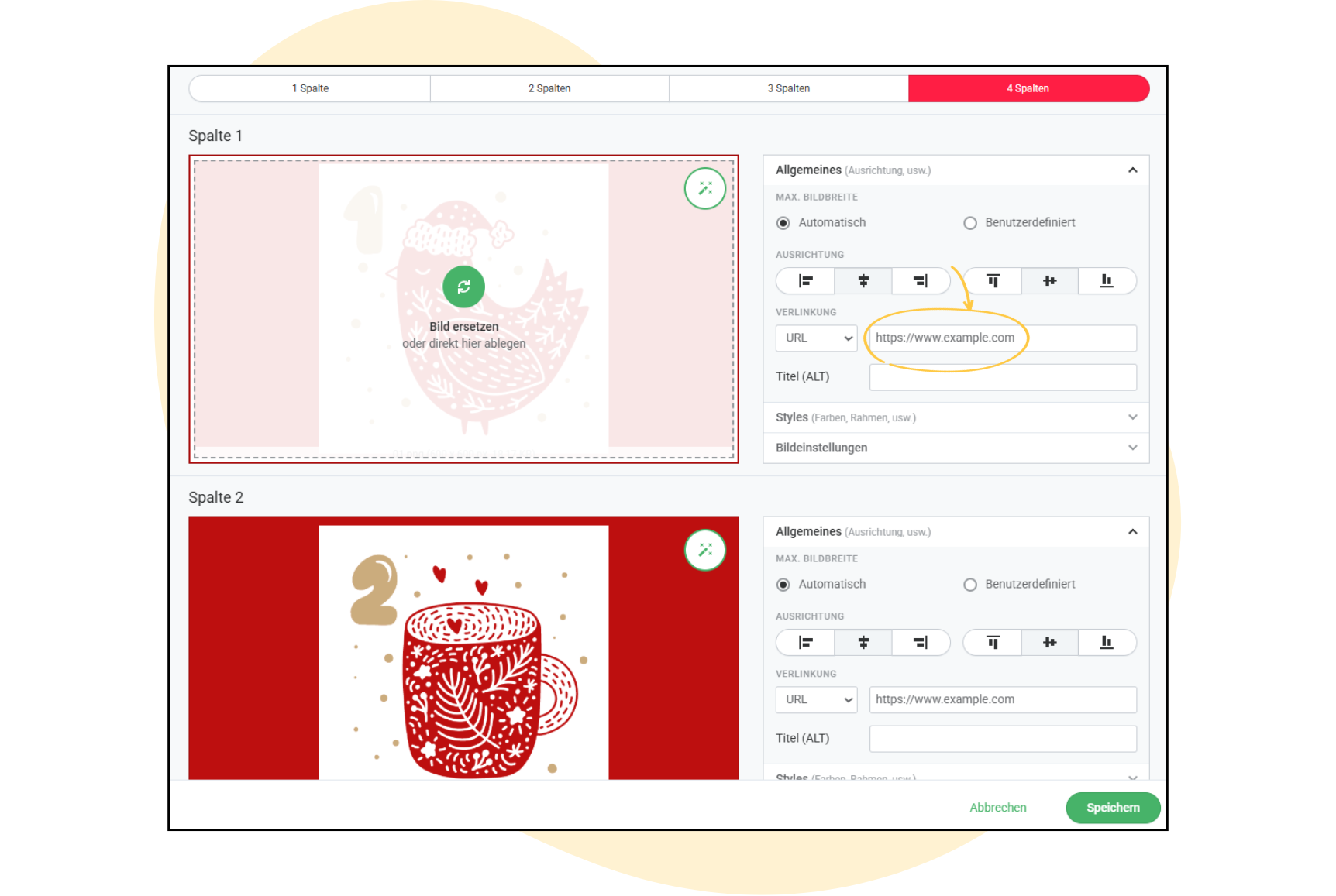 Befüllen Sie nun die einzelnen E-Mails Ihres Adventskalenders: Beginnen Sie mit dem Mailing, das am 1. Dezember versendet wird, und fügen Sie den Link zur Landingpage mit Ihrer Aktion für diesen Tag hinzu, damit Ihre Kontakte beim Klick direkt beim Rabatt, Geschenk oder Inhalt landen.