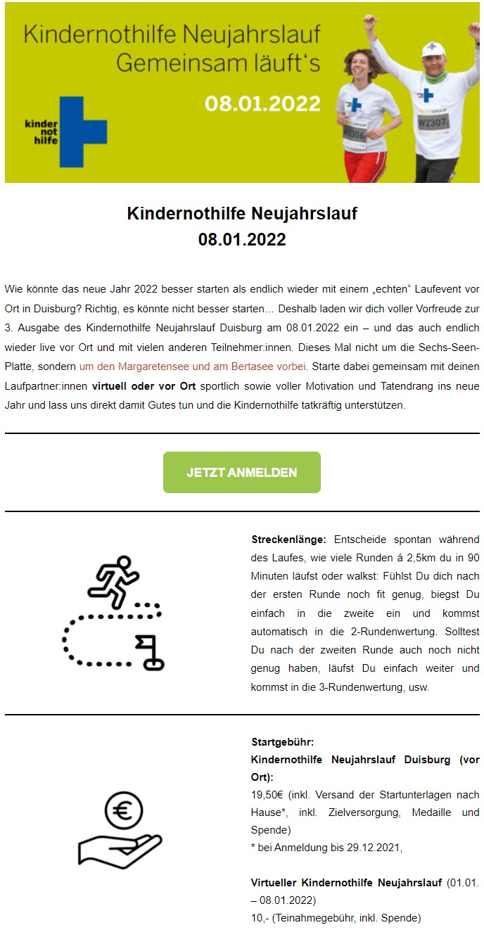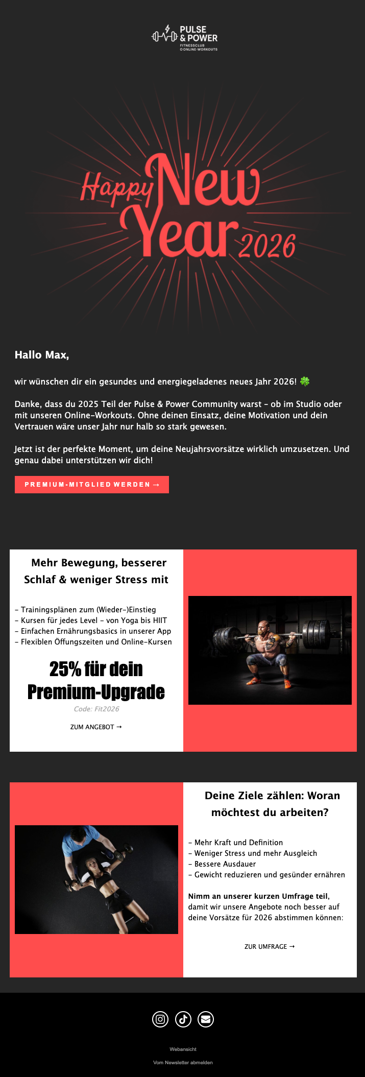 - 🏋️♀️ Betreiben Sie ein Fitness-Studio, eine Fitness-App oder verkaufen Fitnessgeräte? Jackpot. Die beliebtesten Neujahrsvorsätze sind noch immer mit Abstand eine gesündere Lebensweise und mehr Sport. Nutzen Sie diesen Vorteil also für sich und werben Sie in Ihrem Fitness-Newsletter mit Ihren fit-machenden Services und Produkten.