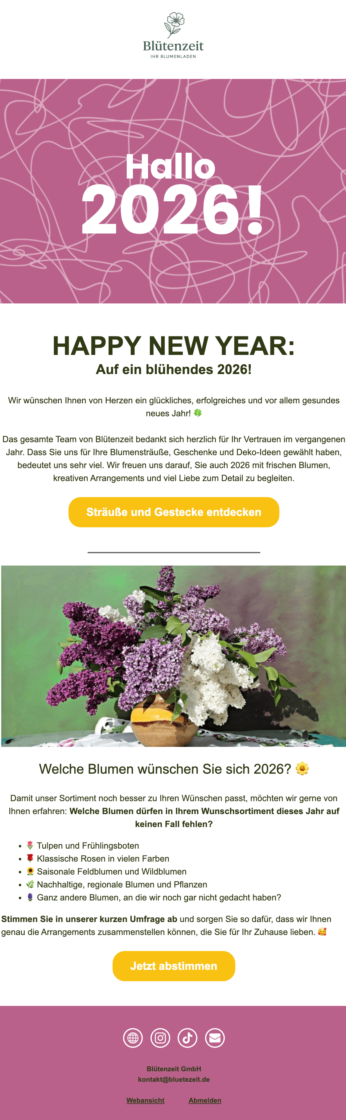 Nutzen Sie die Gelegenheit und bedanken Sie sich bei allen, die zum Erfolg Ihres Unternehmens im letzten Jahr beigetragen haben. Informieren Sie Ihre Leser:innen außerdem darüber, welche neuen Projekte für 2026 geplant sind und worauf sie sich in den kommenden Wochen und Monaten freuen können: