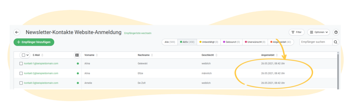Mit rapidmail werden wichtige rechtliche Daten Ihrer Kontakte bei der Newsletter-Anmeldung automatisch gespeichert. Nachdem Interessierte durch das Double-Opt-in Verfahren dem Newsletter-Erhalt zugestimmt haben, können Sie als Versender:in zum Beispiel Kontakt-Informationen wie Zeitpunkt der Newsletter-Anmeldung, Zeitpunkt der Anmeldebestätigung sowie den aktuellen Anmeldestatus ganz einfach einsehen und exportieren.