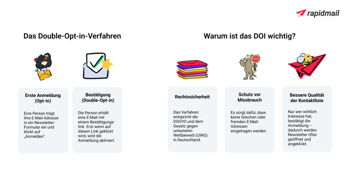 - 💌 Bessere Qualität der Kontaktliste: Nur wer wirklich Interesse hat, bestätigt die Anmeldung – dadurch wird Ihr Newsletter öfter geöffnet und angeklickt.