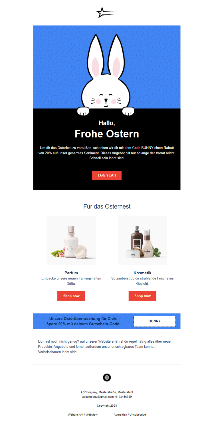 Ein Klassiker für Marketing-Ideen zu Ostern sind Rabattaktionen. Mit einer passenden preislich reduzierten Produktauswahl oder sogar Prozenten auf Ihr gesamtes Sortiment werden sicherlich auch Ihre eher zögerlichen Leser:innen vom Kauf überzeugt. Dazu können Sie ganz einfach Gutscheincodes mit Ihrem Newsletter versenden.