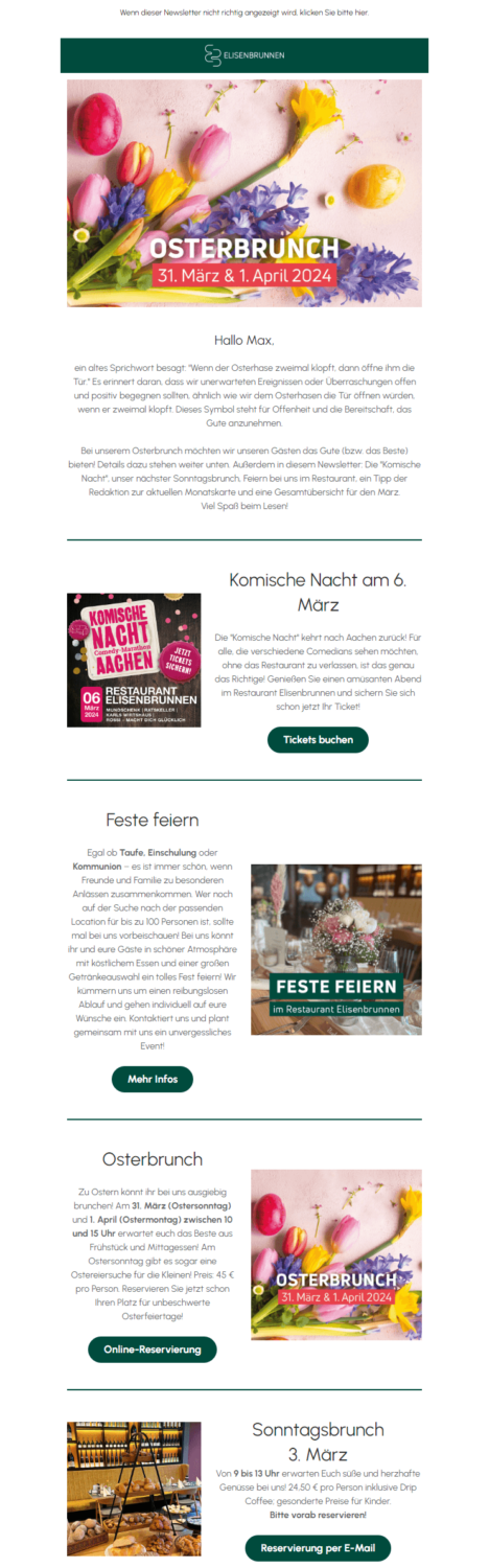 - 🛵 Bieten Sie Ihre Oster-Speisen zur Abholung oder Lieferung an: Gutes Essen am heimischen Esstisch zu genießen ist mittlerweile zur Gewohnheit geworden. Einige Ihrer Newsletter-Abonnent:innen freuen sich bestimmt, wenn sie die Osterfeiertage auch entspannt zu Hause im engsten Familienkreis mit fantastischem Essen verbringen können, ohne selbst stundenlang am Herd stehen zu müssen.