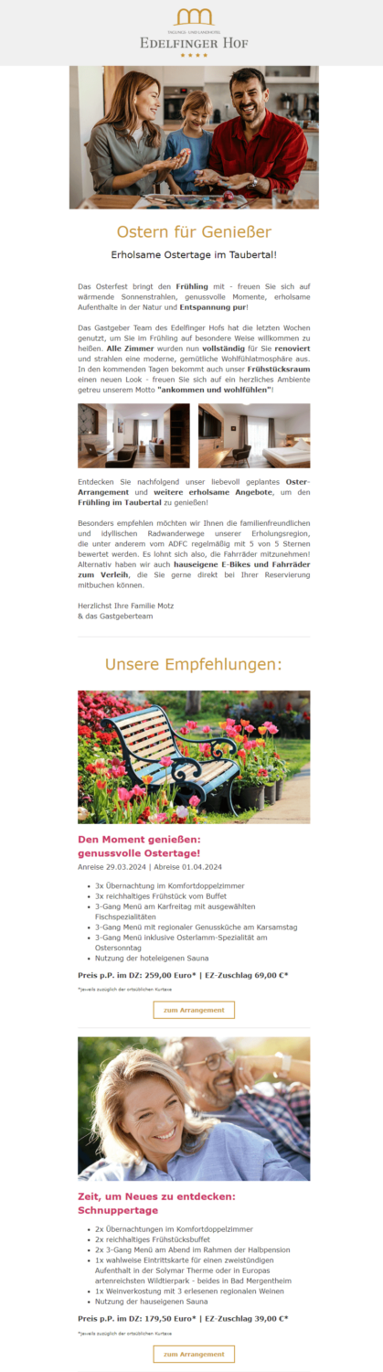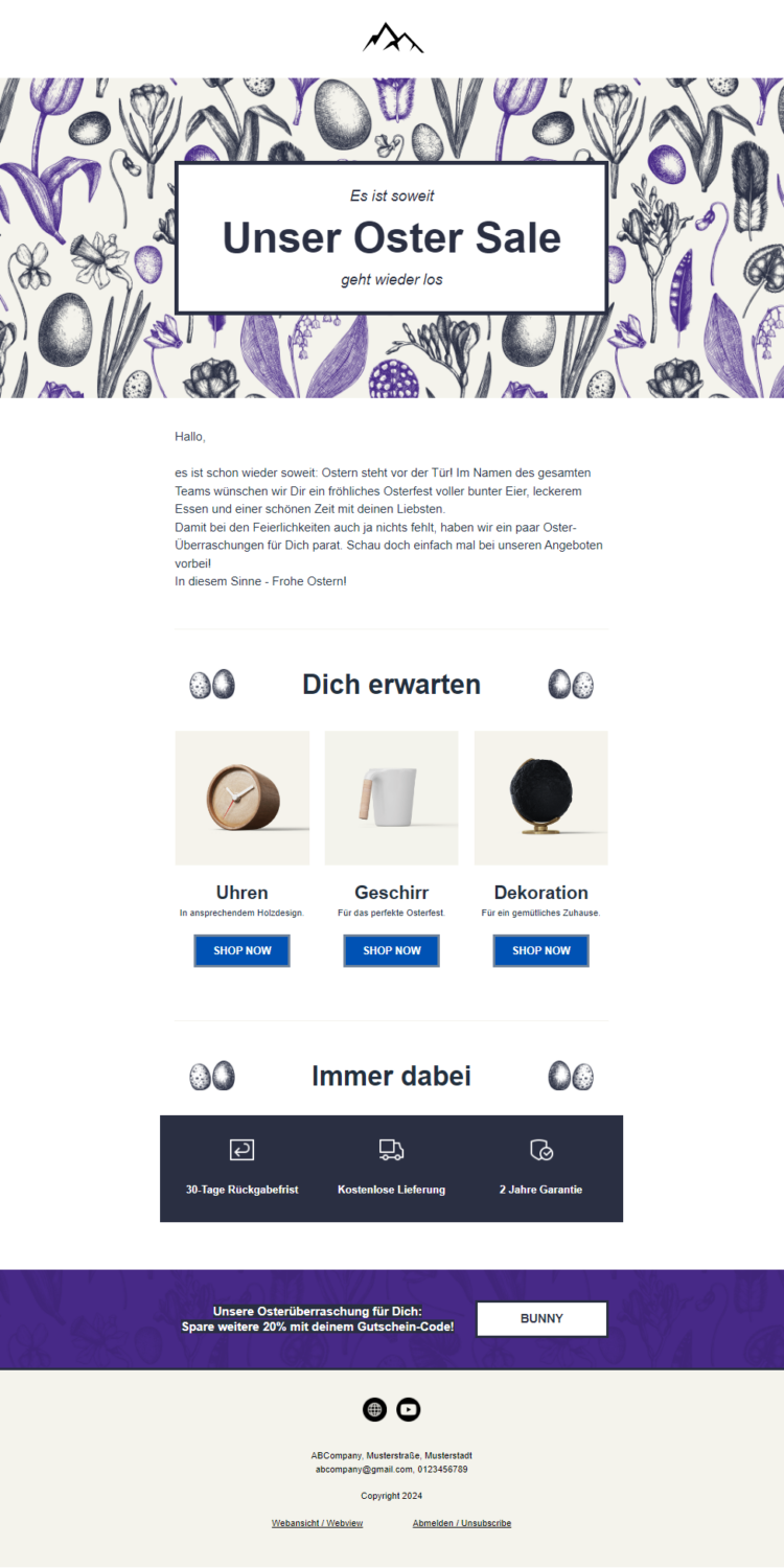 - 🐣 über passende Produkte informieren (z. B. als ideale Geschenkideen) oder neue Produkte vorstellen (z. B. passende Oster-Dekoration aus Ihrer neuen Frühjahrskollektion)