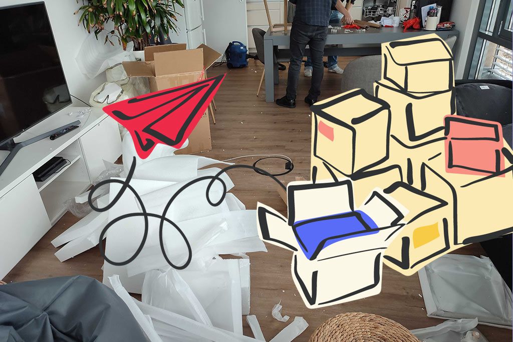 Auch beim Umzug wird bei rapidmail die Hands-on-Mentalität gelebt: Ausgepackt und aufgebaut wird selber! Im neuen Büro angekommen, frischt das ganze Team den Community Raum direkt mit neuen Möbeln auf. Bei Jasmin, unserer Produktmanagerin, schneit’s derweil mitten im Sommer.