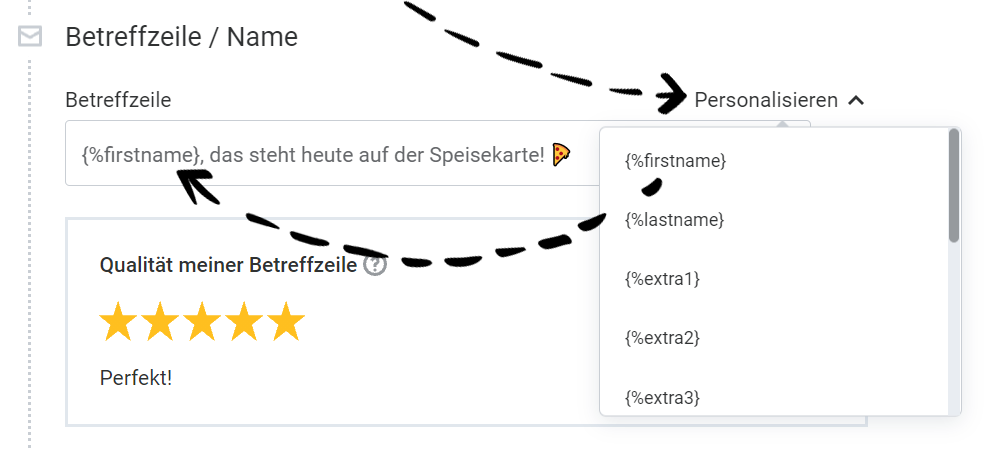 Nicht nur der Name der Empfänger:innen kann im Newsletter-Betreff personalisiert werden. Je nachdem, welche Kundeninformationen Ihnen vorliegen, haben Sie mit rapidmail die Möglichkeit, diese als „Extras” für die Personalisierung einzustellen. Zum Beispiel die Lieblingsprodukte Ihrer Kund:innen oder ihr Wohnort eignen sich perfekt, um die Betreffzeile Ihrer Newsletter zu personalisieren: