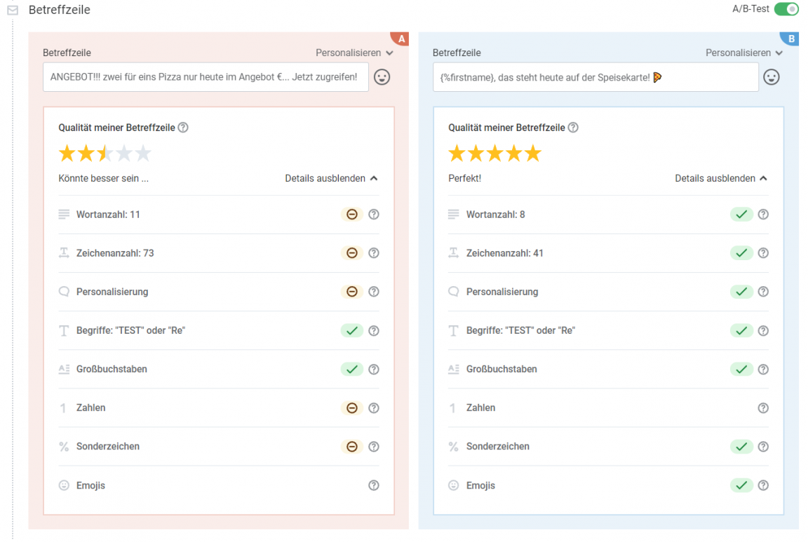 Im rapidmail-Tool bekommen Sie Echtzeit-Feedback für die Qualität Ihrer Betreffzeile. So haben Sie als Versender:in die Möglichkeit, sich ein wenig auszuprobieren, bevor es ans Eingemachte geht und Sie Ihren Newsletter an die breite Masse versenden. Außerdem können Sie durch einen A/B-Test mit zwei verschiedenen Betreffen prüfen, ob eine Variante besser geeignet ist als die andere.