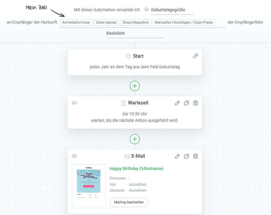 Sie suchen nach einem schnellen und einfachen Weg, um Ihren Kontakten Geburtstagsglückwünsche per E-Mail zukommen zu lassen? Mit rapidmail können Sie Geburtstagsmails für Kund:innen mithilfe des Marketing-Automation-Workflows nur ein einziges Mal erstellen und dann automatisiert an alle Kontakte versenden lassen. Mit unserem intuitiven Mailing-Editor können Sie die Nachricht zum Geburtstag zudem ganz genau so gestalten, wie sie Ihnen am besten gefällt! 🎁