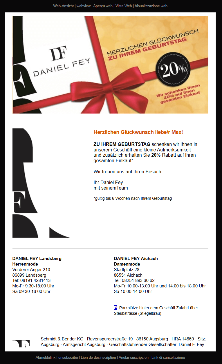 Natürlich ist die Voraussetzung für Personalisierung in der Geburtstagsmail, dass Ihnen die entsprechenden Kundendaten vorliegen. Außerdem müssen Ihre Kund:innen z. B. bei der Registrierung ihr Einverständnis gegeben haben, dass Sie die Daten für den Mailingversand nutzen dürfen.
