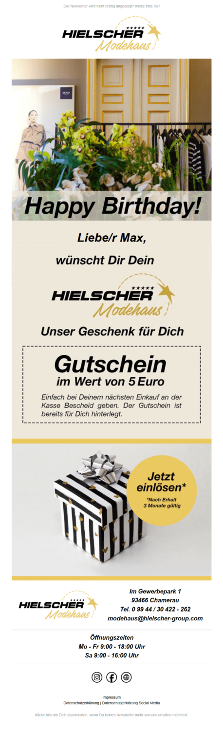 Ihren Kund:innen in der Geburtstagsmail neben den Glückwünschen auch ein Geschenk, Rabatt oder Gutschein mitzuschicken, ist definitiv ein Plus im Hinblick auf die Kundenbindung und die Steigerung Ihres Umsatzes.