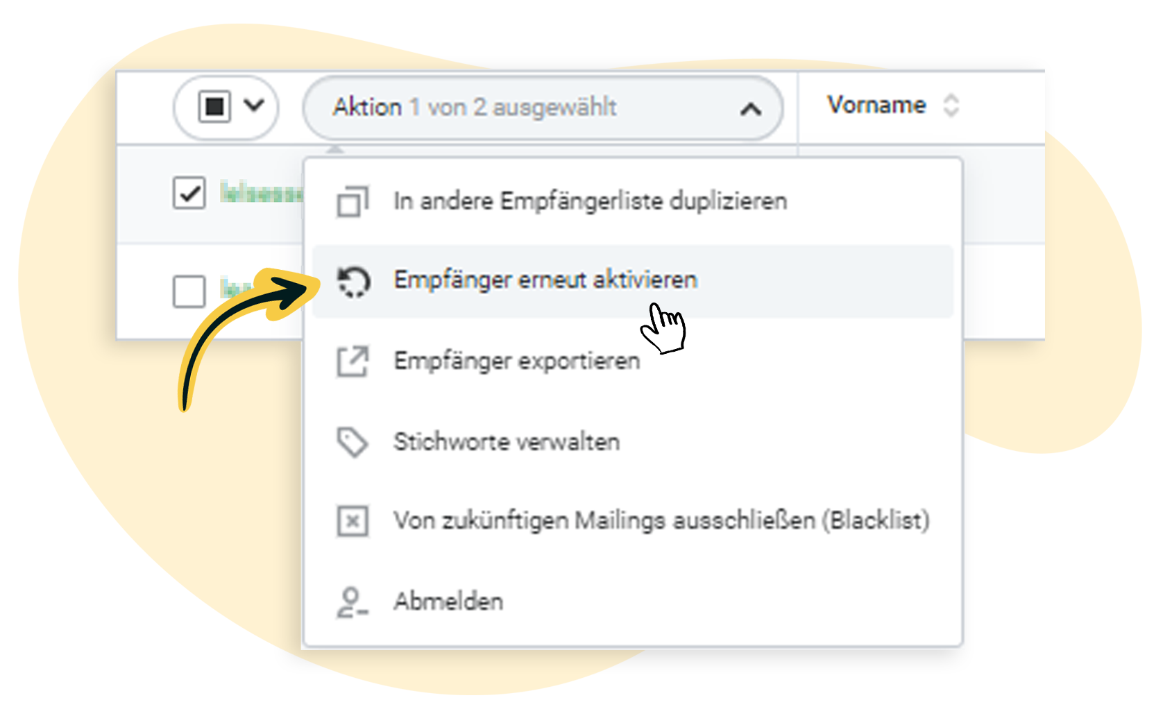 Wir zeigen Ihnen den Prozess beispielhaft für die Reaktivierung Ihrer abgemeldeten Kontakte. Für gebouncte Kontakte ist der Vorgang identisch mit Ausnahme von Schritt 2. Dort finden Sie einen entsprechenden Hinweis.