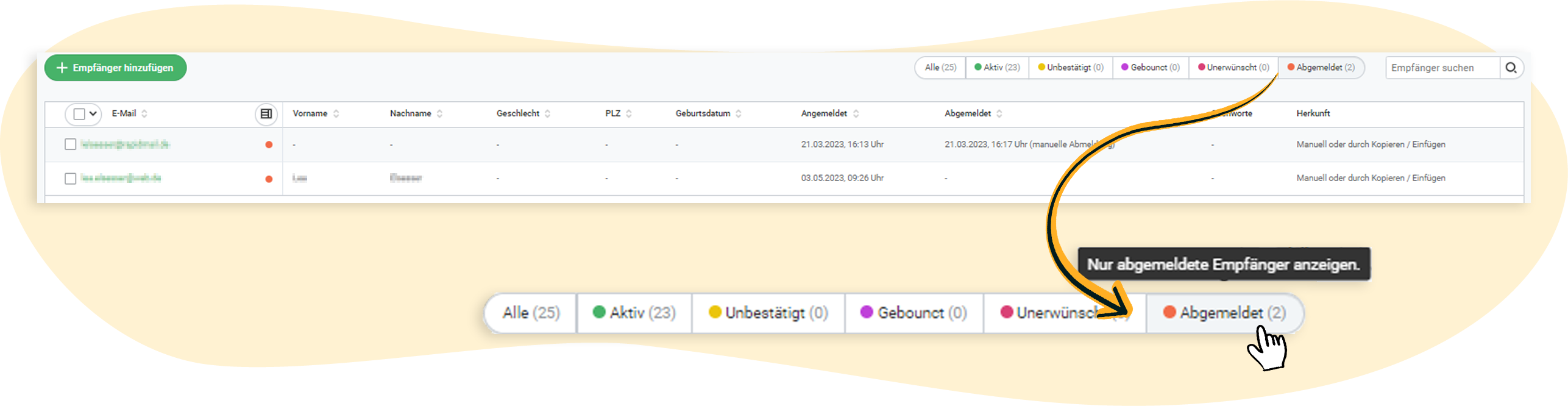 In der oberen Leiste (vgl. Screenshot) finden Sie den Reiter Abgemeldet. Per Klick darauf werden nun ausschließlich die Kontakte angezeigt, die von dieser Liste abgemeldet sind.