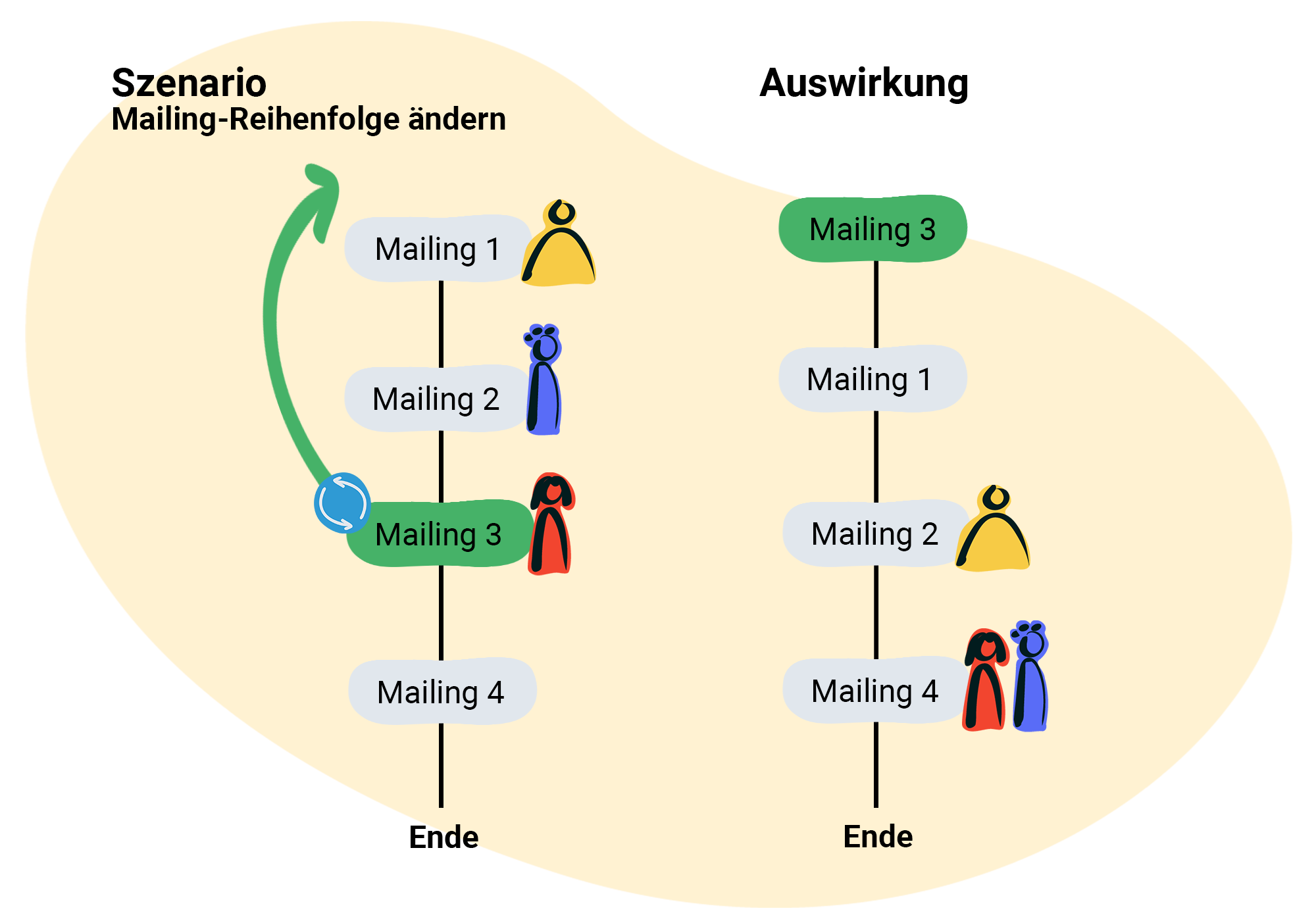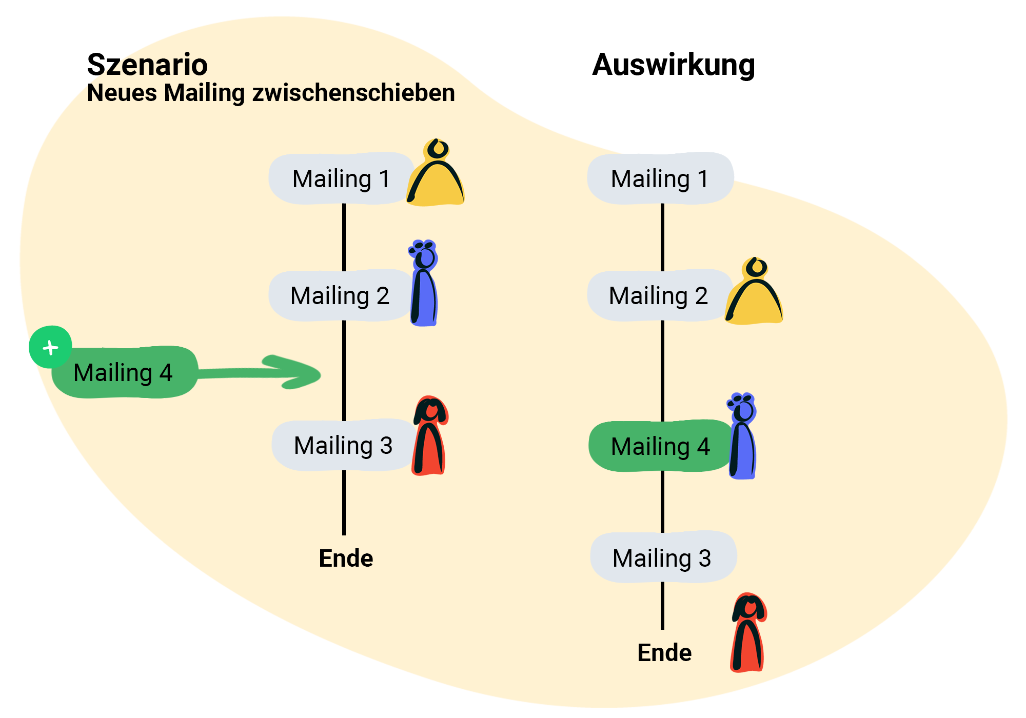- Empfänger Gelb rutscht in der Reihe weiter und erhält mit Mailing 3 sein nächstes automatisches Mailing.