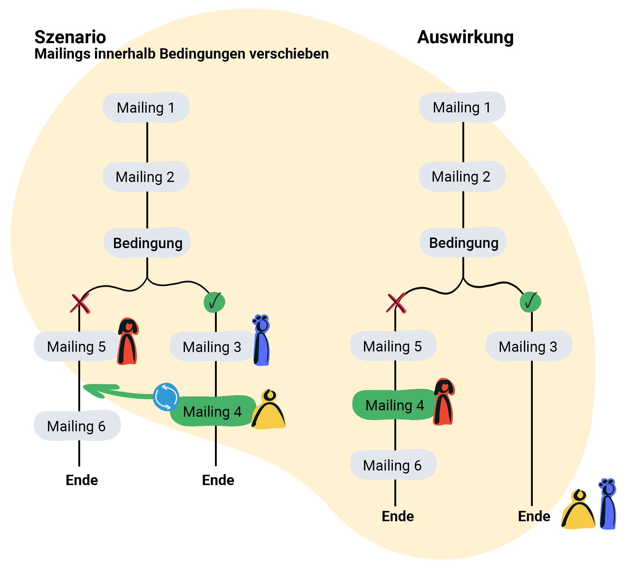 Es ist auch möglich, Mailings innerhalb der Bedingungen zu tauschen oder zu verschieben. Möchten Sie beispielsweise ein Mailing von einem Zweig in den anderen verschieben, hat das folgende Auswirkungen auf den weiteren Verlauf Ihrer Automationsstrecke.