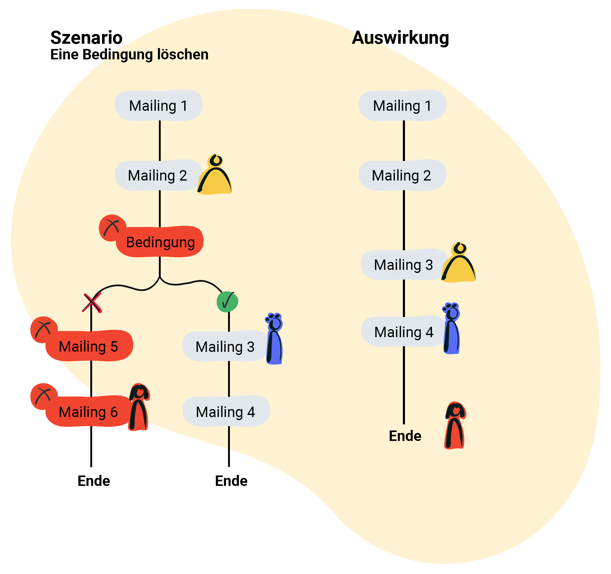 - Empfänger Gelb rutscht nach dem erhaltenen Mailing 2 eins weiter und landet bei der Bedingung, die als nächstes für ihn geprüft wird: Erfüllt er die Bedingung nicht, geht es für ihn mit Mailing 5 und 6 auf dem linken Zweig weiter, erfüllt er die Gegebenheiten Ihrer Bedingung, erhält er die Mailings 3 und 4 des rechten Zweigs.