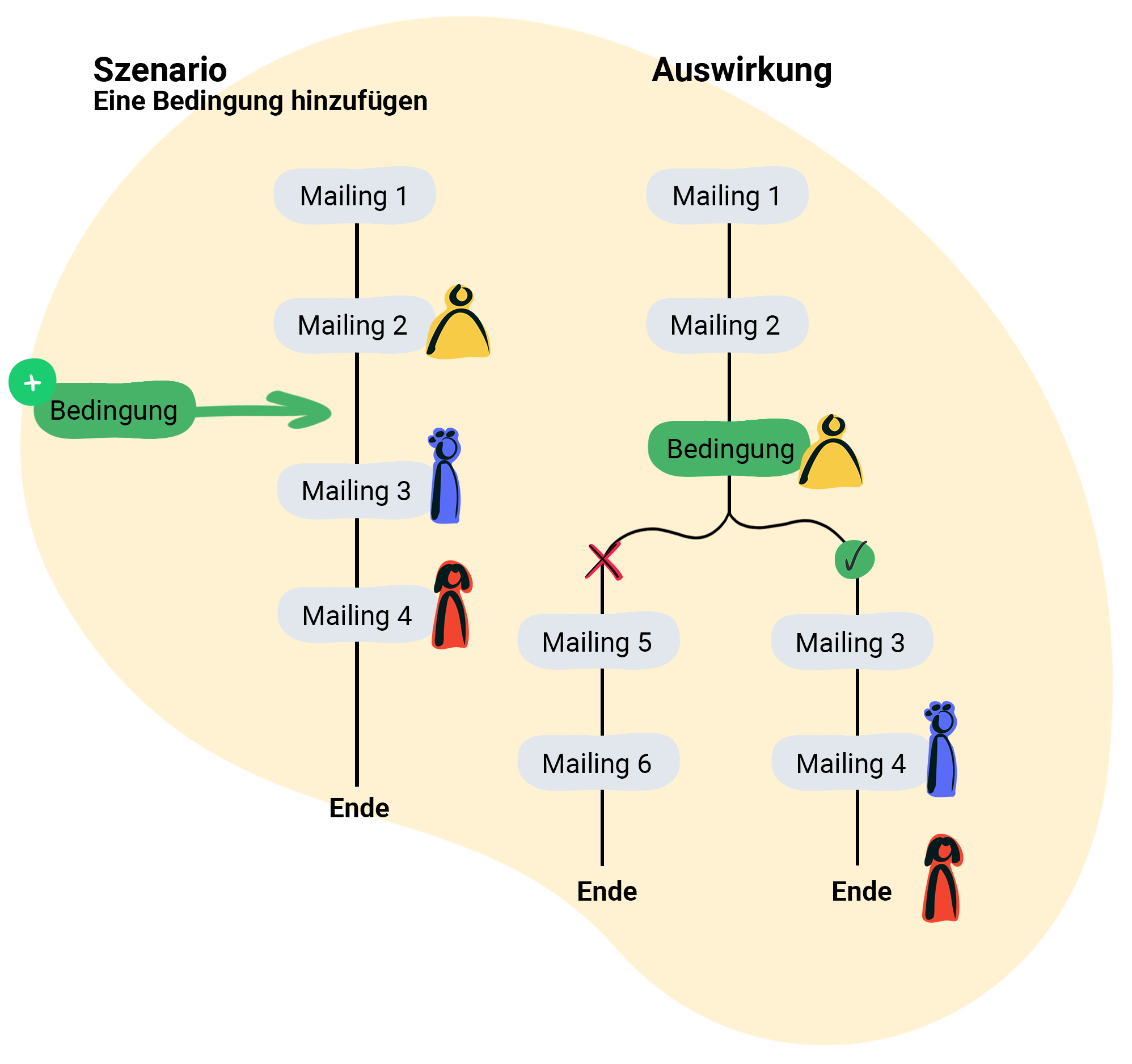 - Empfänger Gelb erhält nun drei, statt zwei, weitere Mailings.