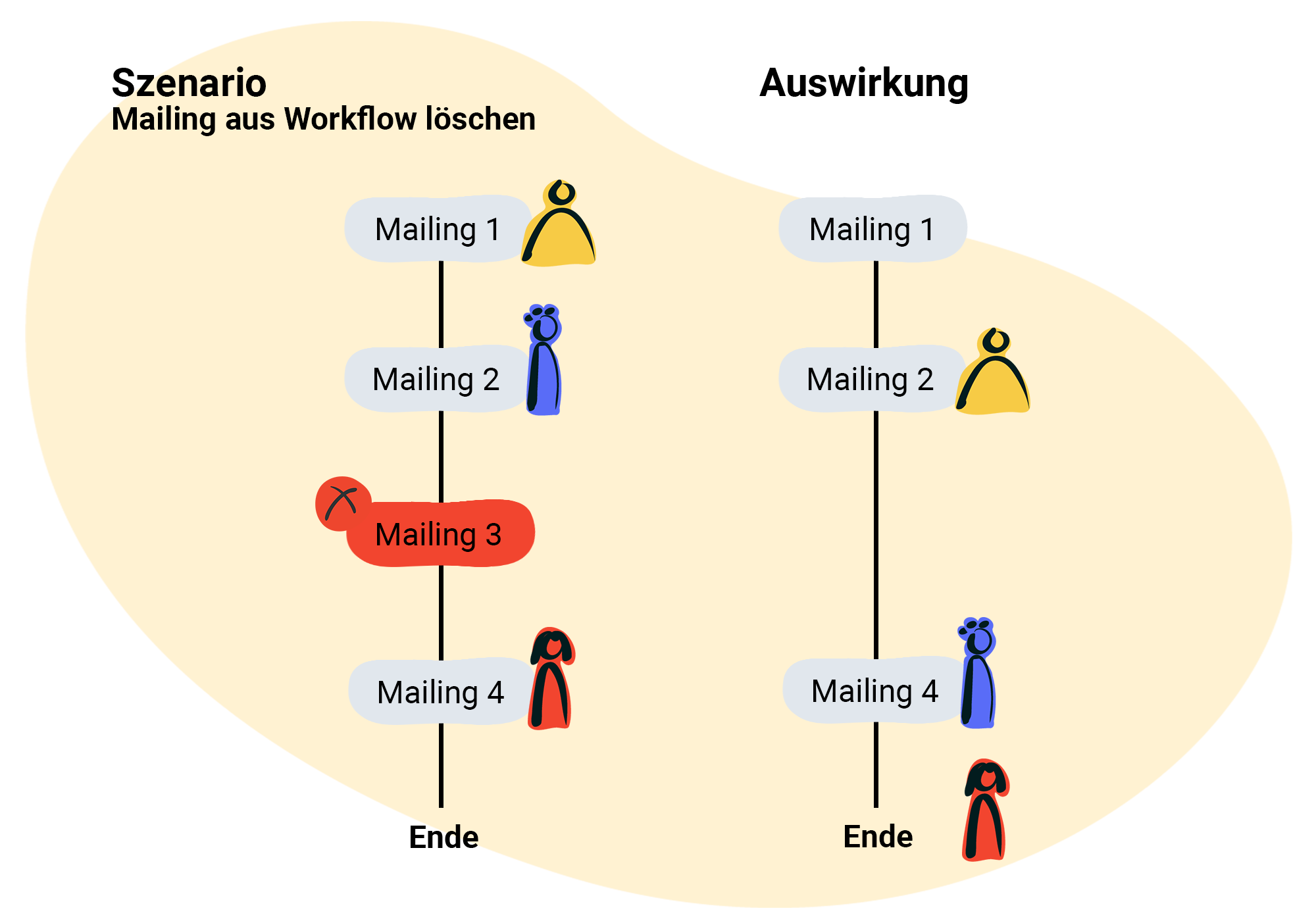 - Für Empfänger Gelb bedeutet die veränderte Reihenfolge, dass er Mailing 3 nicht erhält, da er bereits weiter unten im Workflow angekommen ist.