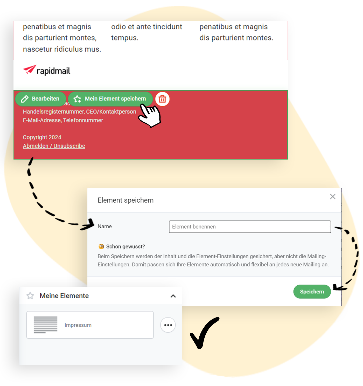 Die Funktion Meine Elemente bietet die Möglichkeit, oft genutzte Elemente global zu speichern und bei Bedarf in den aktuellen Newsletter-Entwurf einzufügen. Dies bietet sich beispielsweise für das Impressum, Ihr Logo oder andere wiederkehrende Elemente an. Wir zeigen in diesem Artikel, wie Sie ein solches Element erstellen, speichern und wieder aufrufen können.