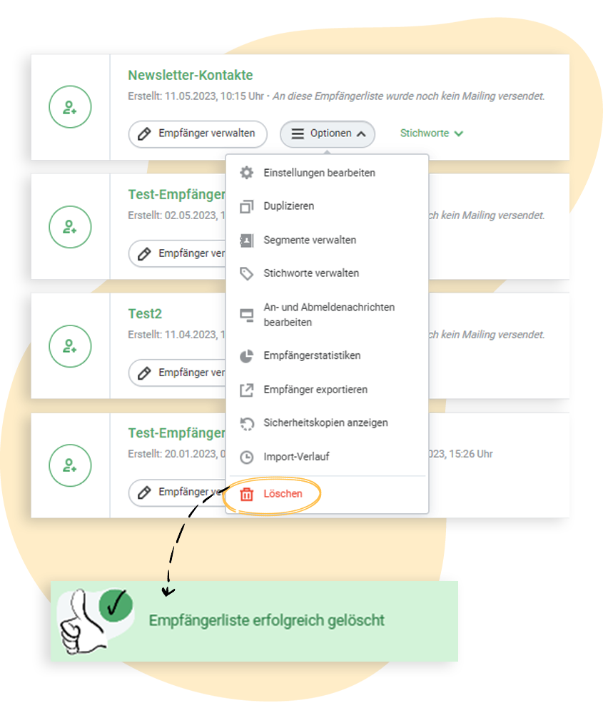 Nun klicken Sie bei der gewünschten Empfängerliste den Button Optionen. Hier finden Sie die Option, die Liste zu löschen. Bestätigen Sie den Vorgang. Sie erhalten eine entsprechende Bestätigungsmeldung, dass Ihre Liste erfolgreich gelöscht wurde.