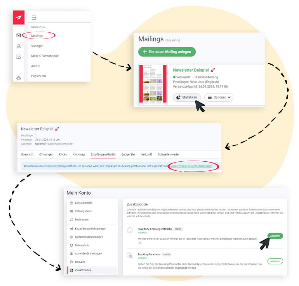 Nach Erhalt des Dokuments schaltet der rapidmail-Support die erweiterte Empfängerstatistik frei. Während unserer Support-Zeiten dauert die Freischaltung nur wenige Minuten.