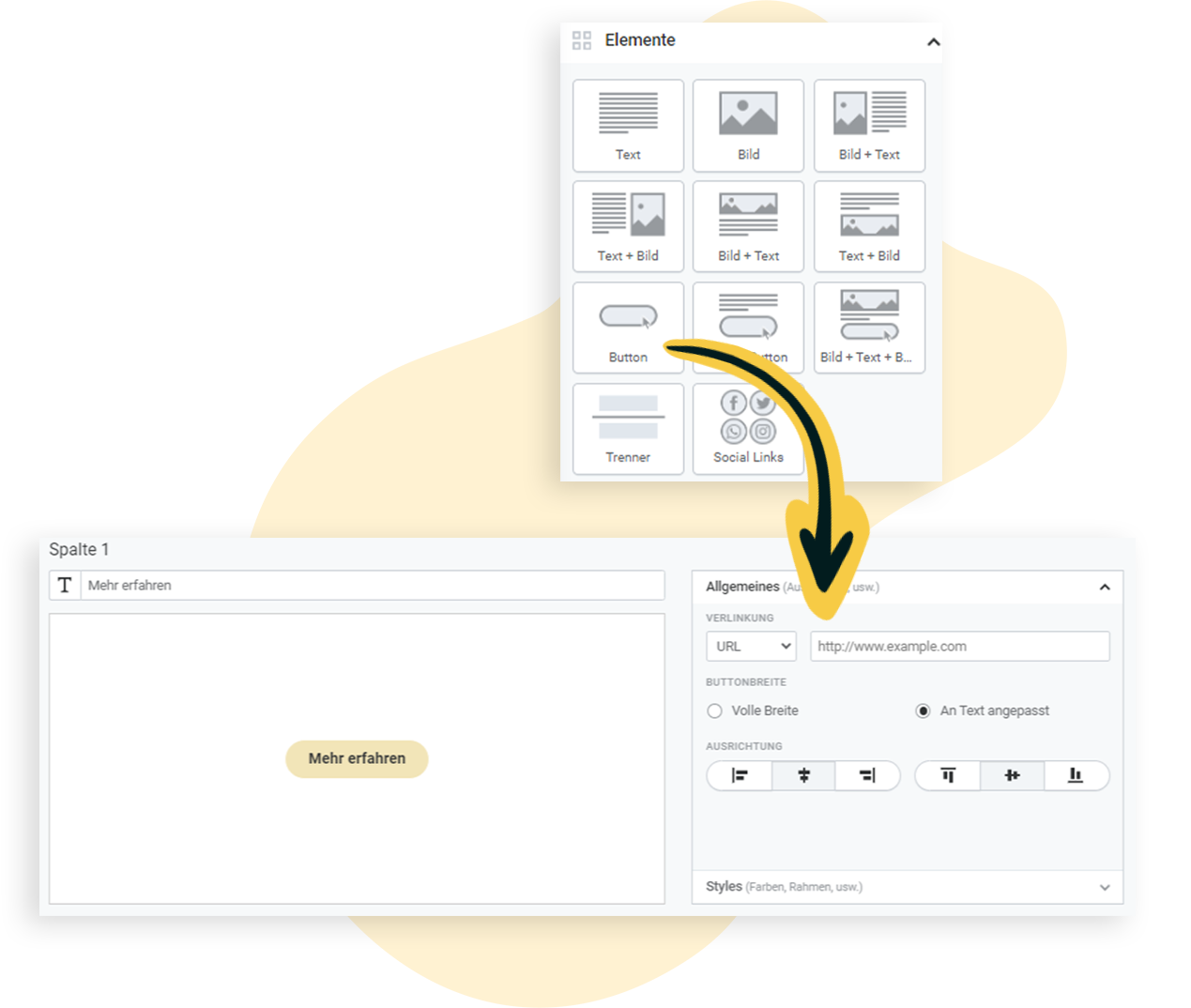 Unter Elemente finden Sie die Schaltfläche Button. Im zugehörigen Textfeld tragen Sie dann den Text ein, der im Button erscheinen soll und auf der rechten Seite unter Allgemeines die Ziel-URL.
