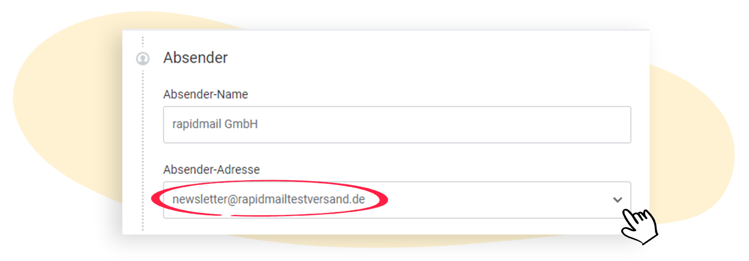Handelt es sich um das Versenden von Mailings innerhalb eines kleinen Teams, raten wir zu einem Workaround: dem Anpassen der Absenderadresse. Dafür wählen Sie bei der Erstellung Ihres Newsletters direkt im ersten Schritt die folgende Absenderadresse aus: newsletter@rapidmailtestversand.de (in seltenen Fällen auch newsletter@nltestdelivery.com). Diese Absenderadresse müssen Sie nicht neu anlegen, sie ist bereits in Ihrem Konto verfügbar.