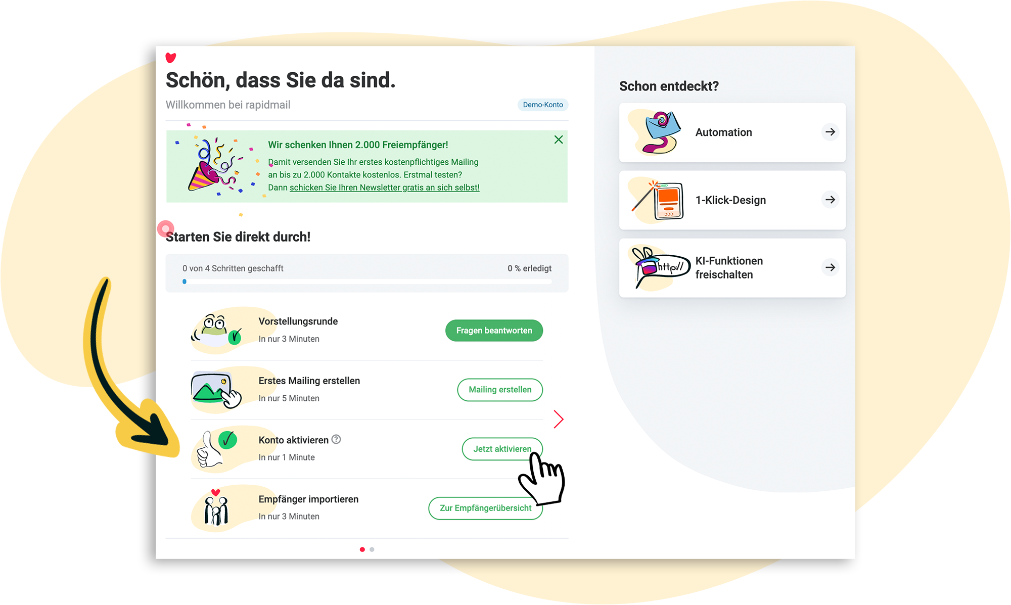 Auf Ihrem rapidmail Dashboard finden Sie verschiedene To Dos, die Ihnen dabei helfen, Ihr Konto einzurichten und die wichtigsten Einstellungen vorzunehmen. Die Konto-Freischaltung ist eines davon: Sie finden sie an der dritten Stelle unter dem Punkt Konto aktivieren. Klicken Sie dort den Button Konto aktivieren.