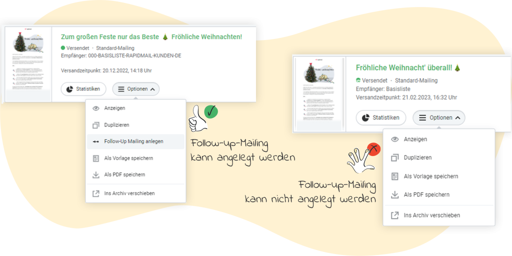 Wenn Sie das Follow-Up Mailing direkt in Ihrer Übersicht beim gewünschten Mailing einstellen möchten, wird Ihnen diese Option lediglich für die versendeten Mailings angezeigt, für die Ihr Tracking eingeschaltet war.