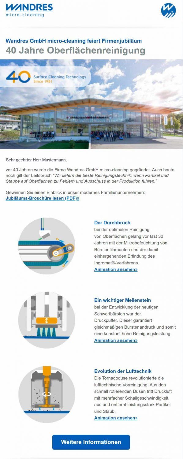 Wenn der Newsletter dann geöffnet wurde, sollte er durch ein ansprechendes E-Mail-Design beeindrucken und direkt beim Öffnen zum Lesen des Inhalts motivieren. Durch treffende Überschriften, hochwertige Bilder, gut strukturierte Absätze und clever platzierte Call-to-Action-Buttons gelingt es Ihnen, Ihre Botschaft und Inhalte auf professionelle Weise zu präsentieren. So wird der Blick Ihrer Leser:innen automatisch auf die wichtigsten Stellen im Newsletter gelenkt.