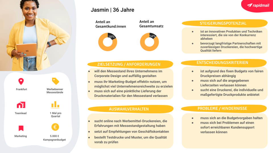 Jetzt zielgruppenorientierte Newsletter erstellenAußerdem lohnt es sich für Personen, die einen Einfluss auf die Kaufentscheidung haben, Personas zu entwerfen. Personas sind fiktive Vertreter:innen Ihrer Zielgruppe, die mit ganz konkreten Eigenschaften versehen werden, um eine detaillierte und vielfältige Vorstellung von der Zielgruppe zu gewinnen, die selbstverständlich aus vielen individuellen Entscheidungsträger:innen besteht.