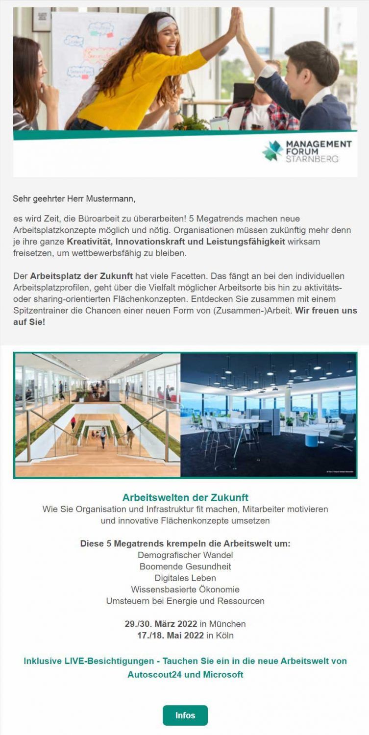 E-Mail-Marketing im B2B kann Ihnen helfen, zwischenmenschliche Beziehungen herzustellen und zu intensivieren, neue Geschäftskunden zu gewinnen und langfristig zu binden, Interesse für Ihre Produkte und Dienstleistungen zu wecken, Leads zu generieren, Ihren Umsatz zu steigern und Kunden zu informieren und auf dem Laufenden zu halten.