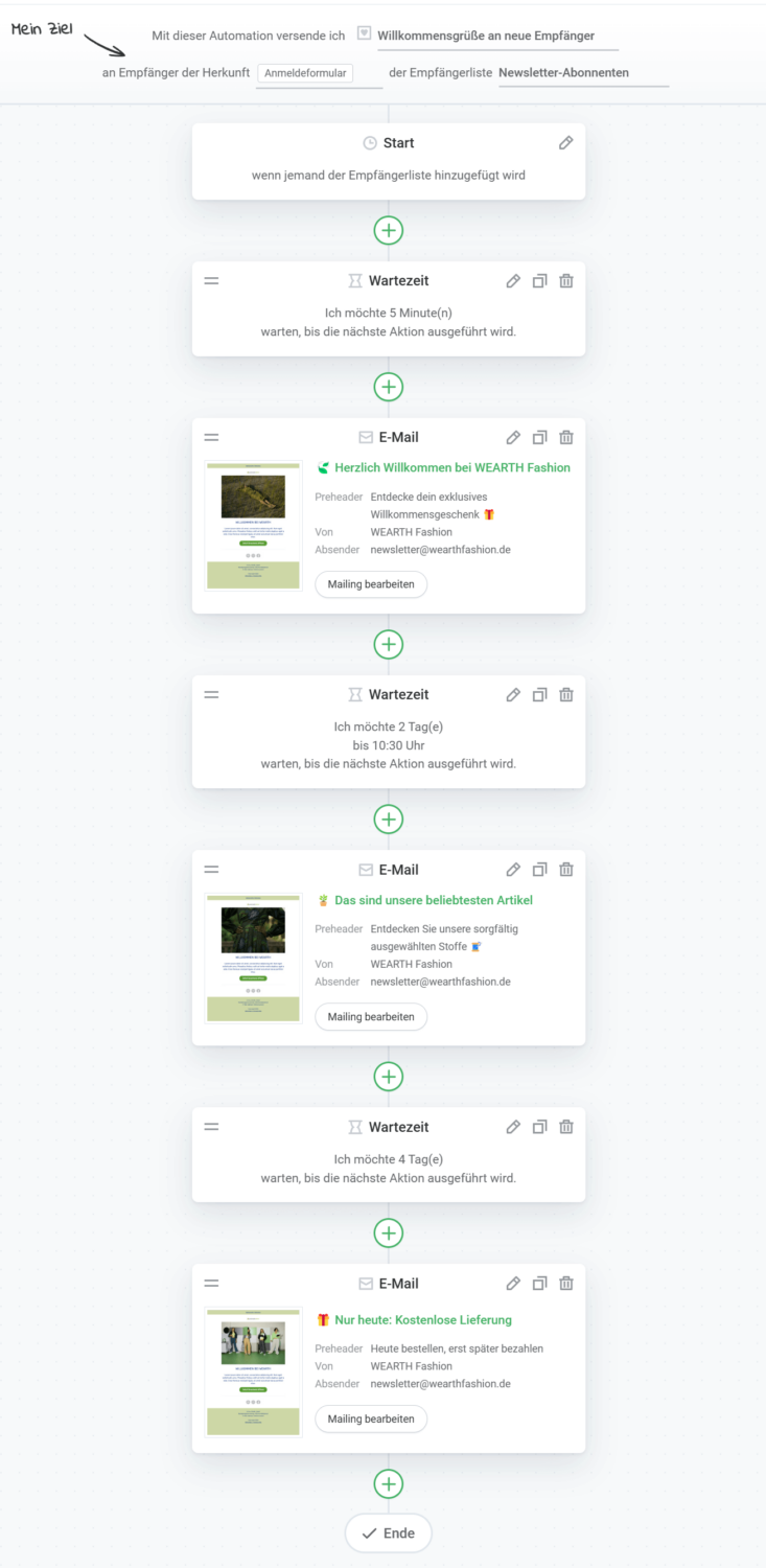 • 🚀 Direkt nach einer Newsletter-Anmeldung: Starten Sie eine Willkommensserie, die neue Kontakte abholt, Vertrauen aufbaut und den Einstieg in Ihre Marke erleichtert.