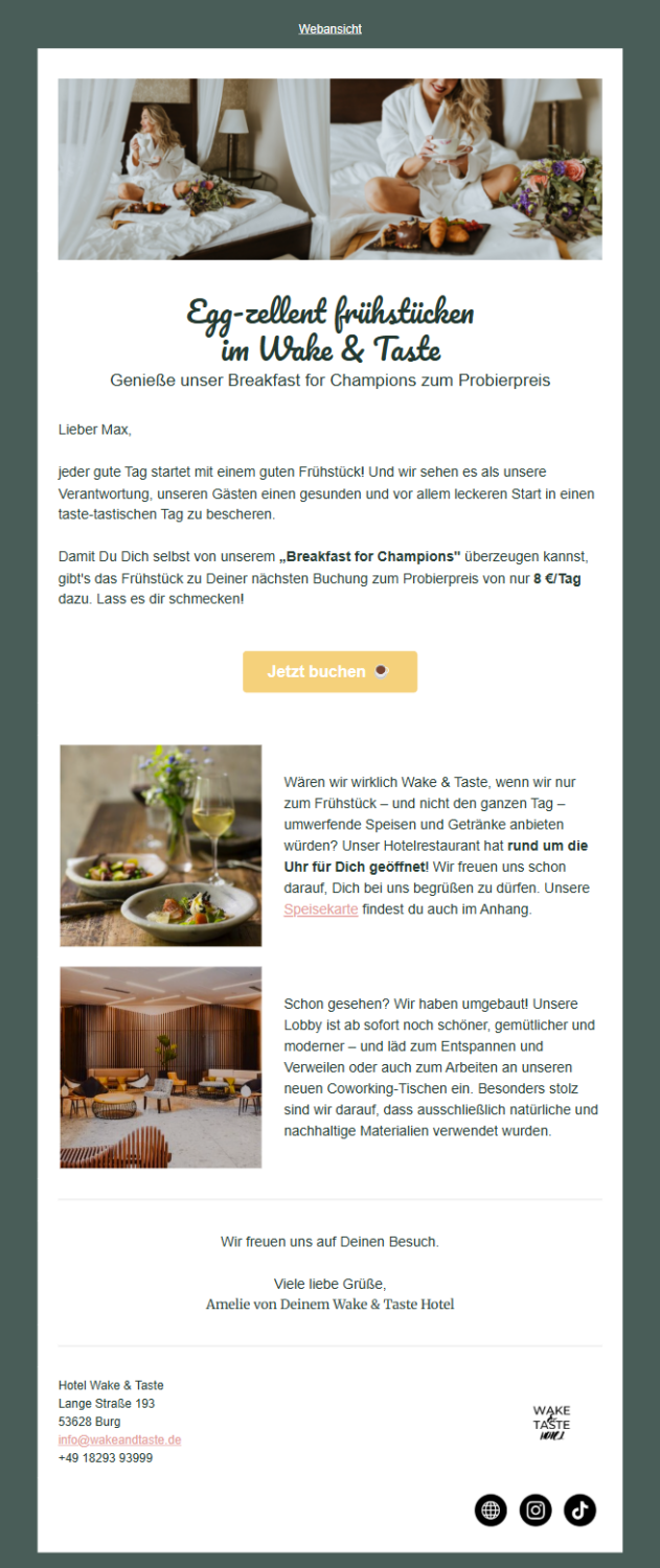 Beispiel einer schön designten Drip-E-Mail als Teil eines automatisierten Workflows: Nach jedem abgeschlossenen Hotelaufenthalt erhalten die Hotelgäste sechs Monate später automatisch eine E-Mail mit einem Frühstücksrabatt für die nächste Buchung. Das cleane Design, die hochwertigen Fotos und der auffällige Call-to-Action-Button unterstützen das luxuriöse Markenimage und animieren die Kontakte zur nächsten Buchung. (erstellt mit rapidmail)