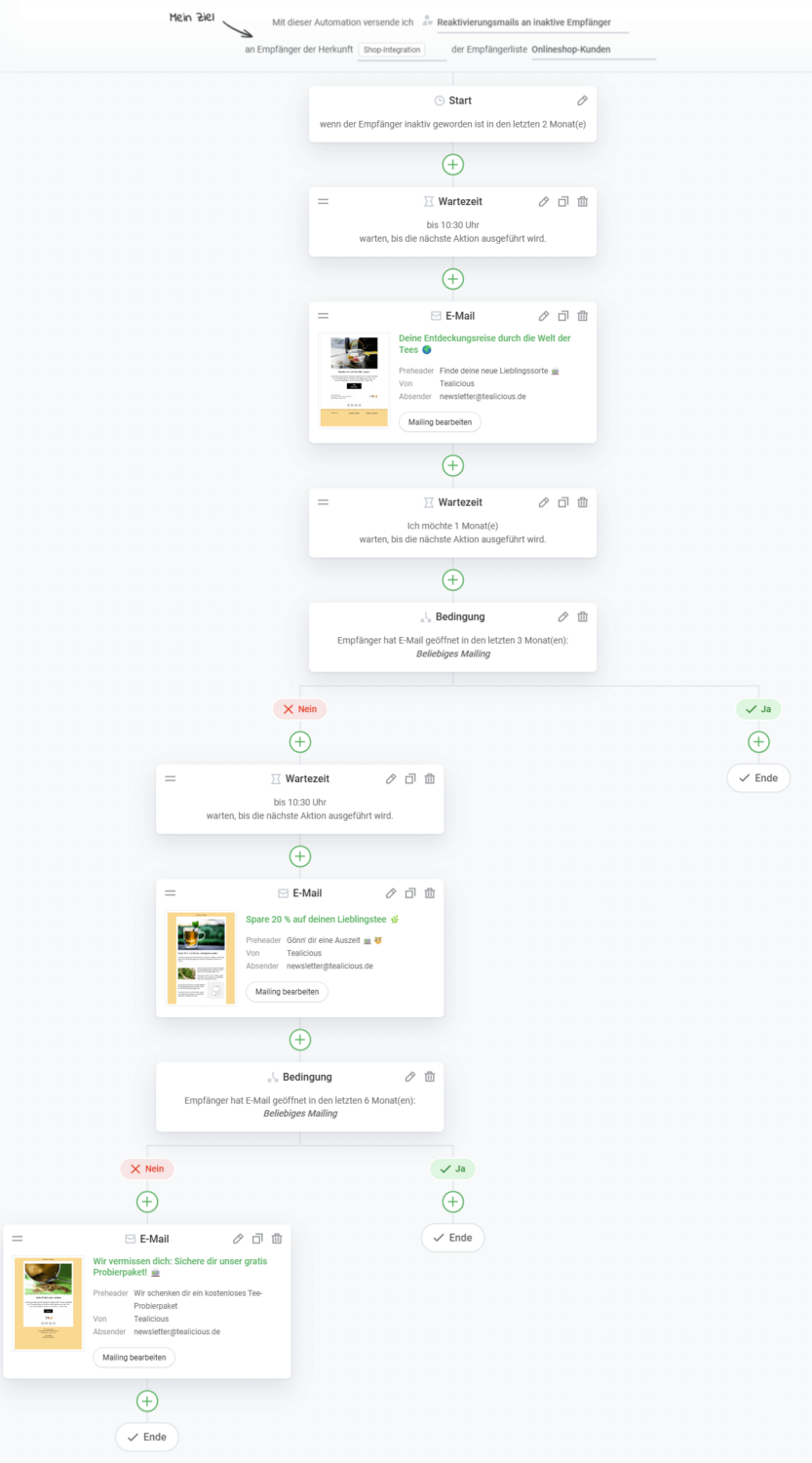 👍🏻 Mit Drip-Marketing: Sie bereiten eine Serie an Reaktivierungsmails vor, die automatisiert an alle Kontakte verschickt wird, die schon lange keinen Ihrer Newsletter mit Tee-Angeboten mehr geöffnet haben. Die Reaktivierungskampagne besteht aus einem Mix an unschlagbaren Rabattaktionen und interessanten Produktangeboten, die Ihre inaktiven Kontakte dazu motivieren, endlich wieder den Kontakt aufzunehmen.