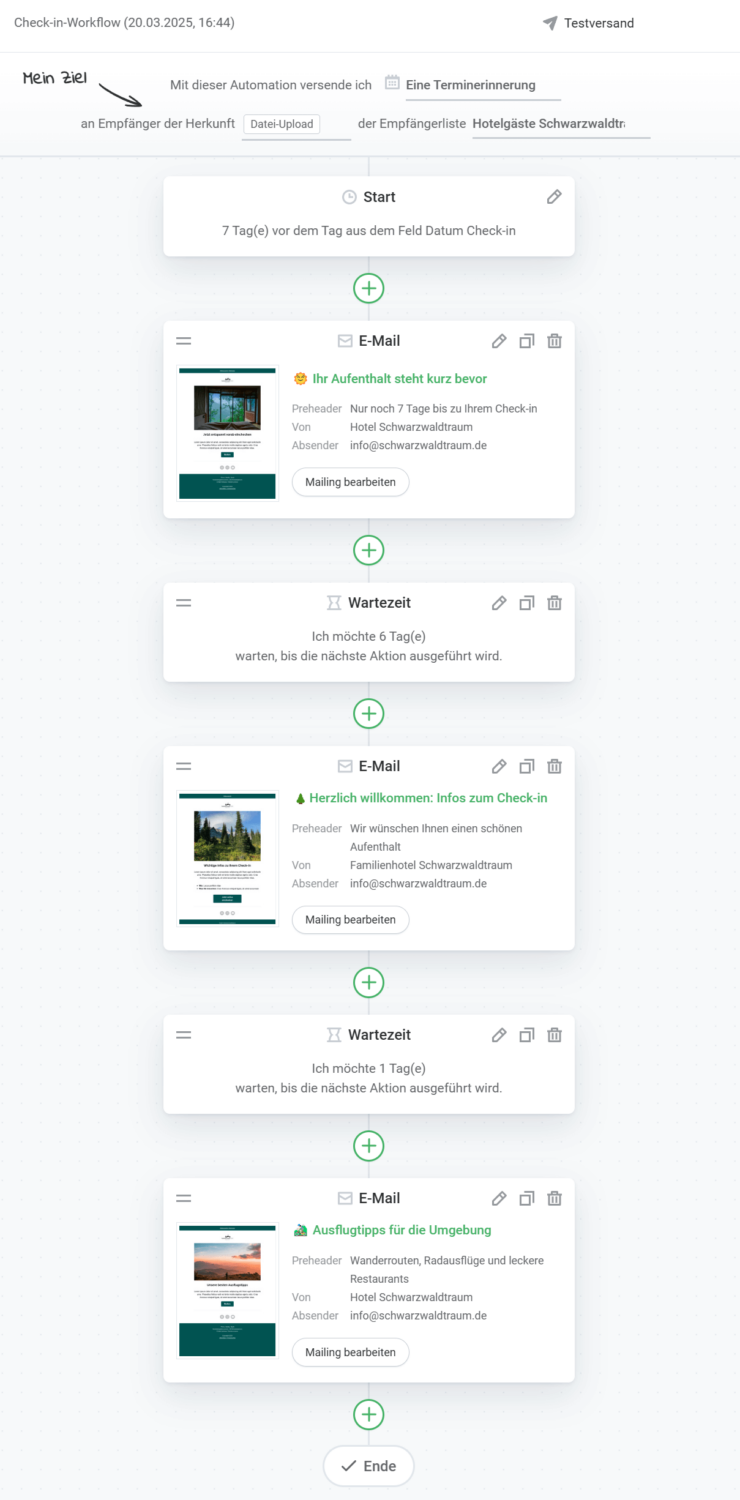 • 🔗 Sind alle E-Mail-Schritte richtig miteinander verknüpft? Prüfen Sie, ob die E-Mails im Workflow logisch aufeinander folgen – ohne Lücken oder Endlosschleifen.