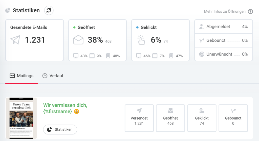 • 📬 Öffnungsrate: Werden Ihre E-Mails gelesen? Wie ansprechend finden Ihre Kontakte Ihre formulierten Betreffzeilen?