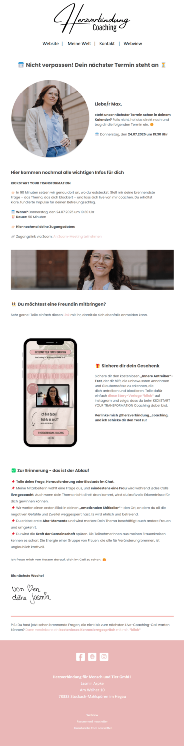 Praxisbeispiel für gelungenes Drip-Marketing: Für Herzverbindung Coaching schickt Jasmin automatisierte Terminerinnerungen für anstehende Coaching-Termine und sorgt so dafür, dass die Veranstaltung bei den Teilnehmenden nicht in Vergessenheit gerät. (erstellt mit rapidmail von der Werbeagentur UNARTIG)