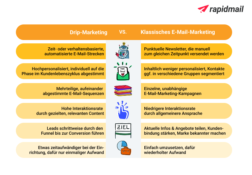 Infografik mit Gegenüberstellung von Drip-Marketing vs. klassischem E-Mail-Marketing