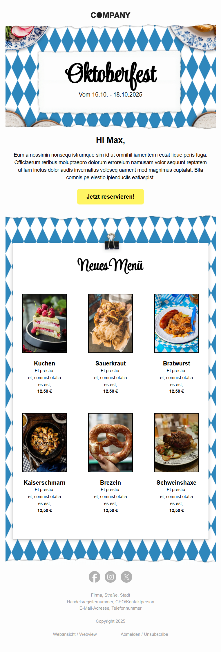 Zum Start des weltweit bekannten Oktoberfests können Sie Ihren Newsletter so richtig aufbrezeln! 🥨 Das größte Volksfest der Welt startet 2026 am 19. September. In Ihrem Oktoberfest-Newsletter lassen sich viele Produkte passend zum Volksfest vermarkten – egal ob das fesche Outfit für die „Wiesn”, die dazu passenden Accessoires, den Aktivitäten-Tipp für den Tag nach dem Oktoberfest oder die kulinarische Vorbereitung mit Weißwurst und „Brezen”…