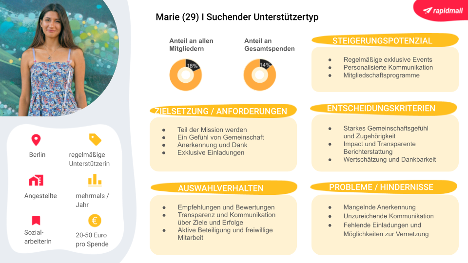 | Suchender Unterstützer-Typ | – Bedürfnis nach Zugehörigkeit→ möchte Teil Ihrer Mission werden | – Vermittlung eines Gemeinschaftsgefühls– Dank für die Unterstützung– Einladungen zu Veranstaltungen für Mitglieder und Unterstützer:innen |